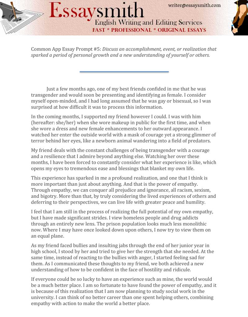 Below is a sample essay for the Common App's fifth 2019/2020 essay prompt: Discuss an accomplishment, event, or realization that sparked a period of personal growth and a new understanding of yourself or others. If you need help writing an essay for the Common App or another college application, contact our SOP Writing Services or send us an email at writer@essaysmith.com! Common App Essay Prompt (5)