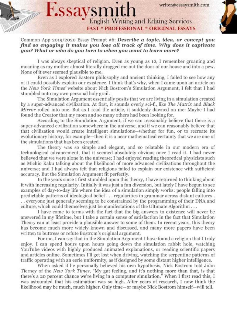 Below is a sample essay for the Common App's sixth 2019/2020 essay prompt: Describe a topic, idea, or concept you find so engaging it makes you lose all track of time. Why does it captivate you? What or who do you turn to when you want to learn more? If you need help writing an essay for the Common App or another college application, contact our SOP Writing Services or send us an email at writer@essaysmith.com! Common App Essay Prompt (6)