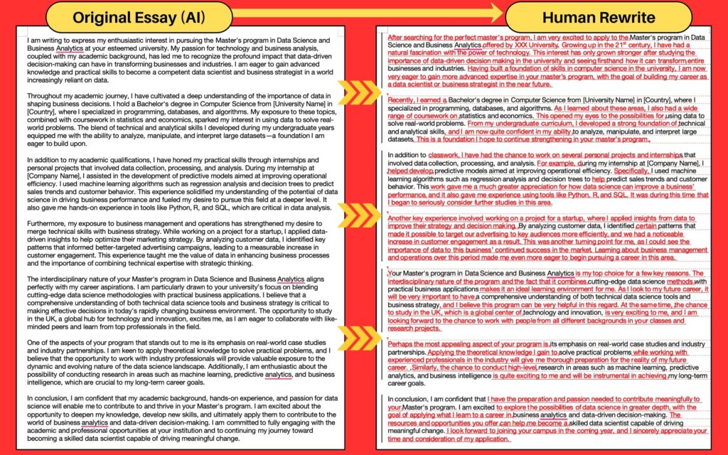 As you can see, the essays on the left and right are very similar in their content. But the essay on the left feels like it was written by a robot, while the essay on the write feels much more like it was written by a human.