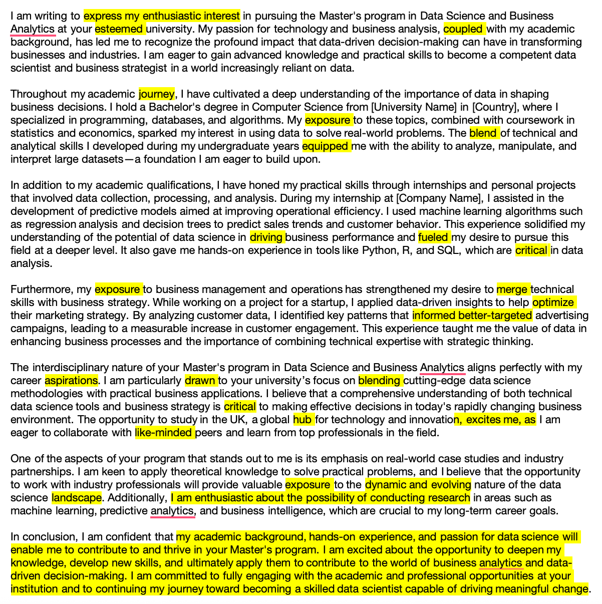 Here is an AI-generated essay (a Personal Statement for a graduate school application). In the essay, I highlighted all of the words or phrases that seem like AI:
